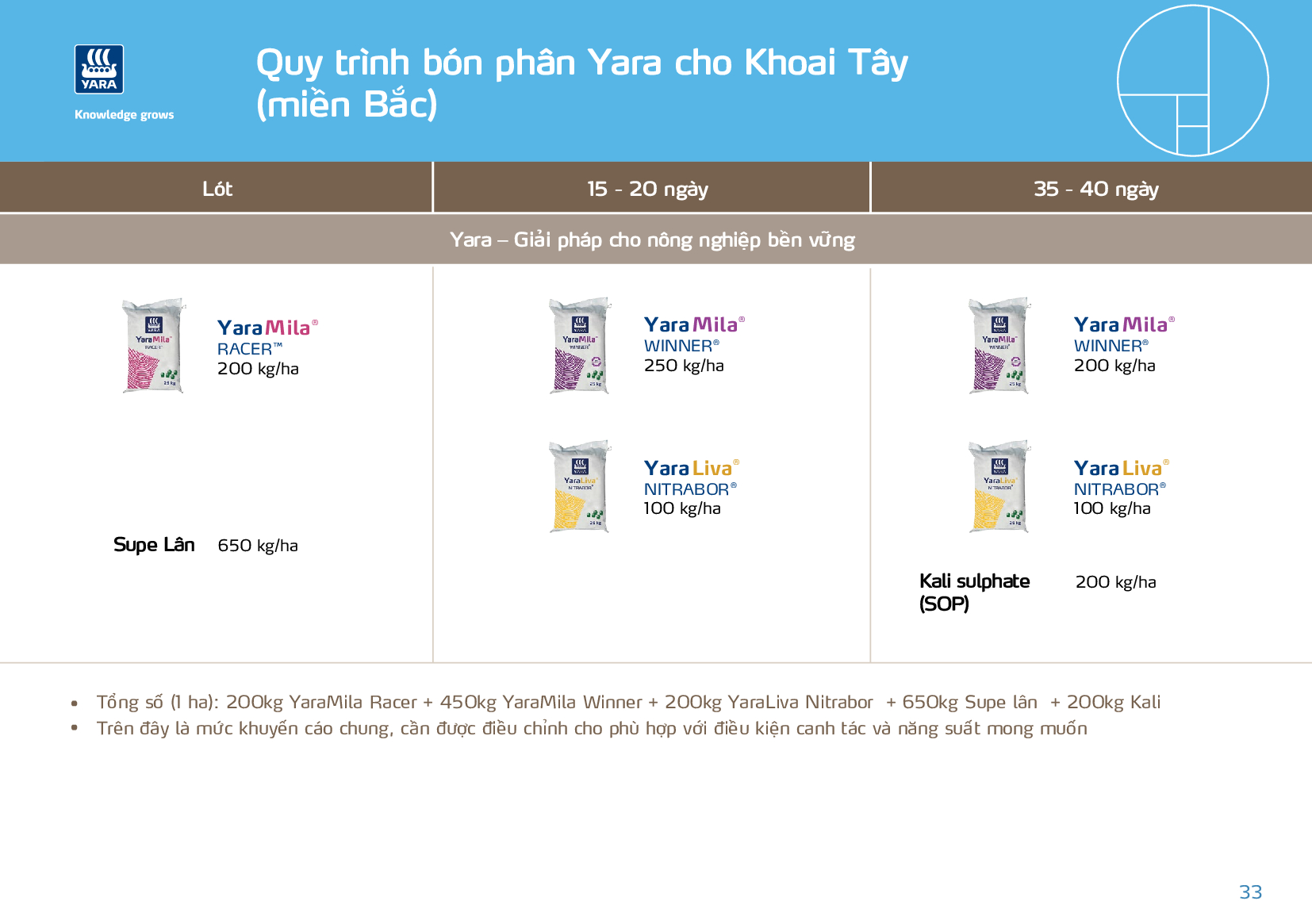 Tuyên bố miễn trừ trách nhiệm: Đối với kiến thức và sự hiểu biết tốt nhất từ phía Yara, thông tin trong tài liệu này là chính xác kể từ ngày biên soạn. Tuy nhiên, Yara không tuyên bố, bảo đảm hoặc cam kết về độ chính xác, độ tin cậy, tính đầy đủ, tính kịp thời và hoặc sử dụng của thông tin. Trách nhiệm của người dùng là xác định phù hợp và đầy đủ thông tin này đối với mục đích sử dụng hoặc mục đích cụ thể của người dùng. Nội dung thông tin phải được điều chỉnh cho phù hợp với điều kiện địa phương và người dùng phải luôn đọc nhãn hiệu cho từng sản phẩm trước khi sử dụng. Yara không nhận bất kỳ trách nhiệm pháp lý nào đối với bất kỳ tổn thất hoặc thiệt hại nào có thể xảy ra từ bất kỳ việc sử dụng thông tin này