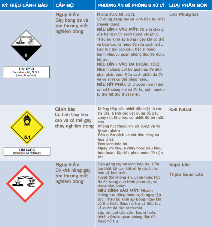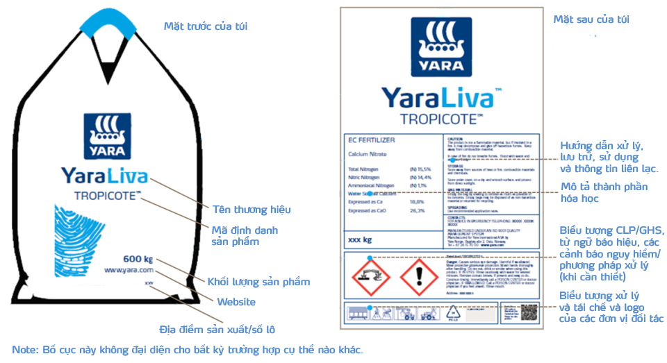 Nhãn trên bao bì chứa nhiều thông tin pháp lý quan trọng trong các khâu vận chuyển, bảo quản và xử lý phân bón. Thành phần hóa học của sản phẩm được ghi trên bao bì phù hợp với quy định của từng quốc gia và thị trường phân phối.