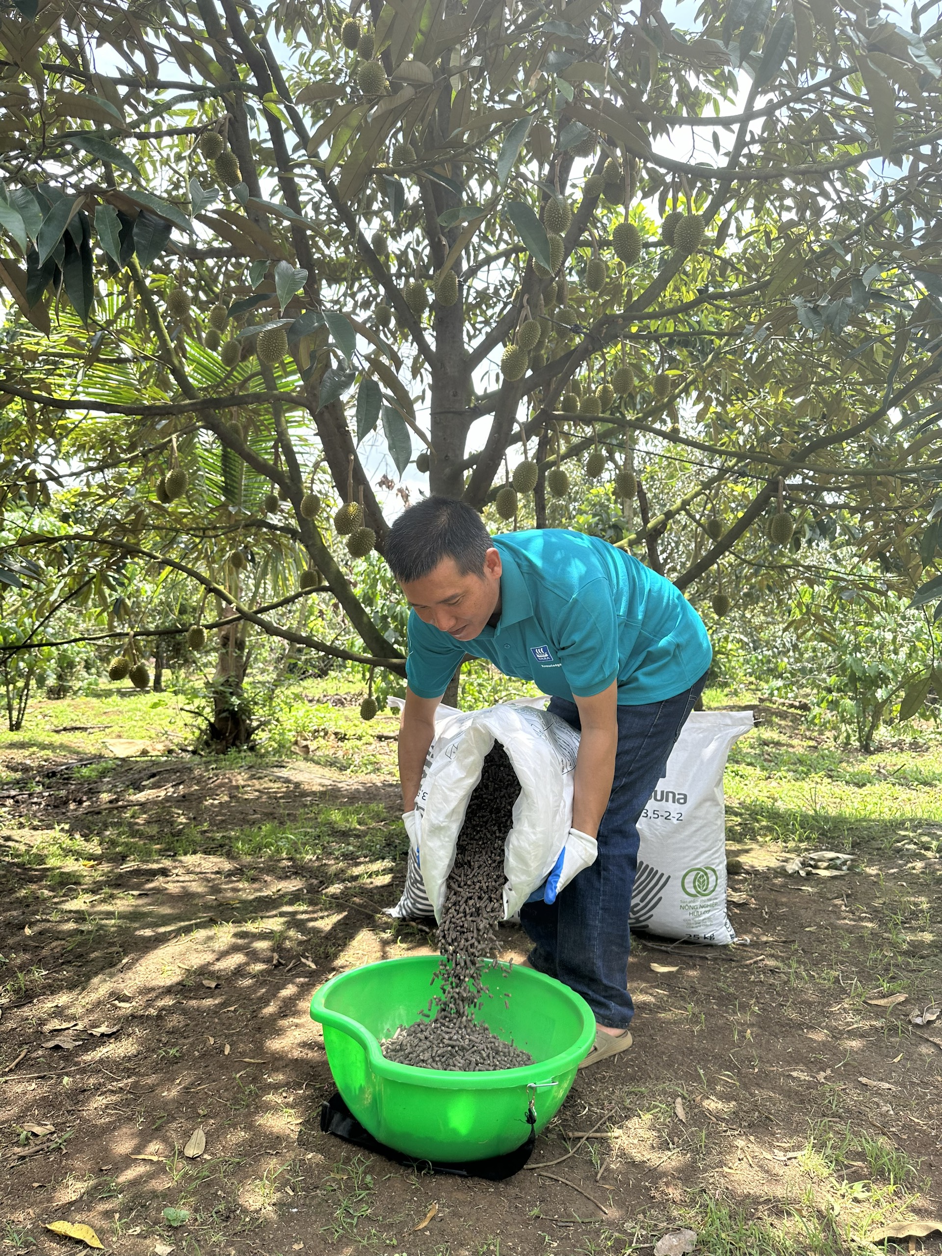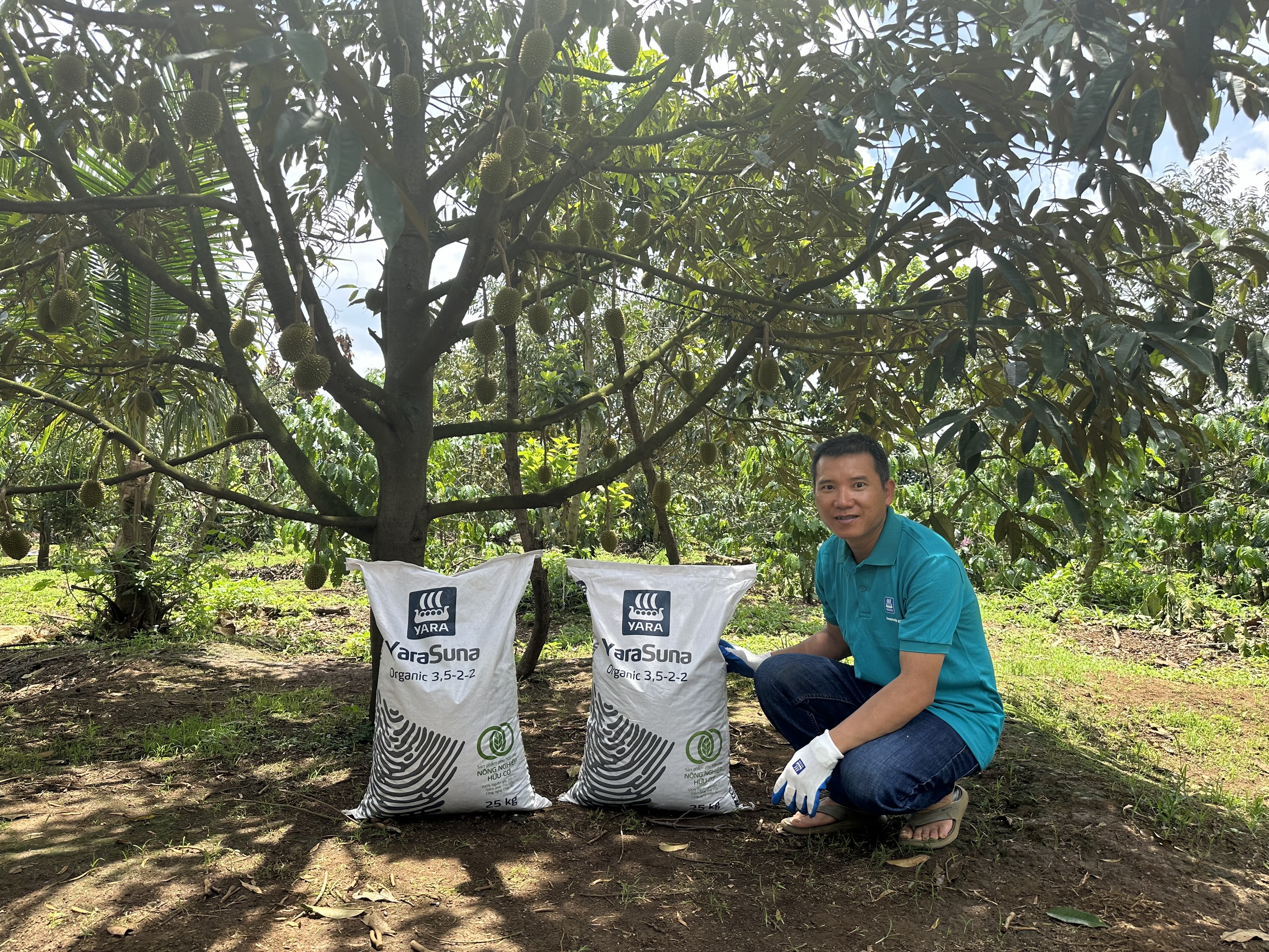 Vườn sầu riêng của tôi đang trong giai đoạn cải tạo và kiến thiết năm thứ 4-5. Trong đó, tôi dùng phân bón hữu cơ YaraSuna để cải tạo đất thì thấy đất tơi xốp, tăng độ phì. Cây sầu riêng khỏe, phát triển tốt, đọt xanh và dày. Cây ít bị sâu bệnh tấn công. Hy vọng vườn nhà tôi sẽ cho năng suất tốt cho vụ mùa năm nay